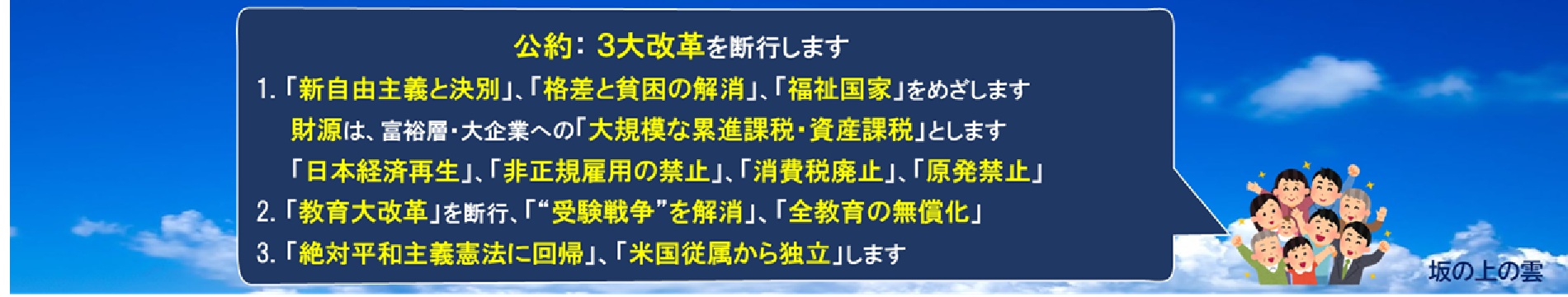 ⑤「税制大改革」と「財政健全化」; 「大規模な累進課税・資産課税」を断行し、福祉・教育政策の財源とします。